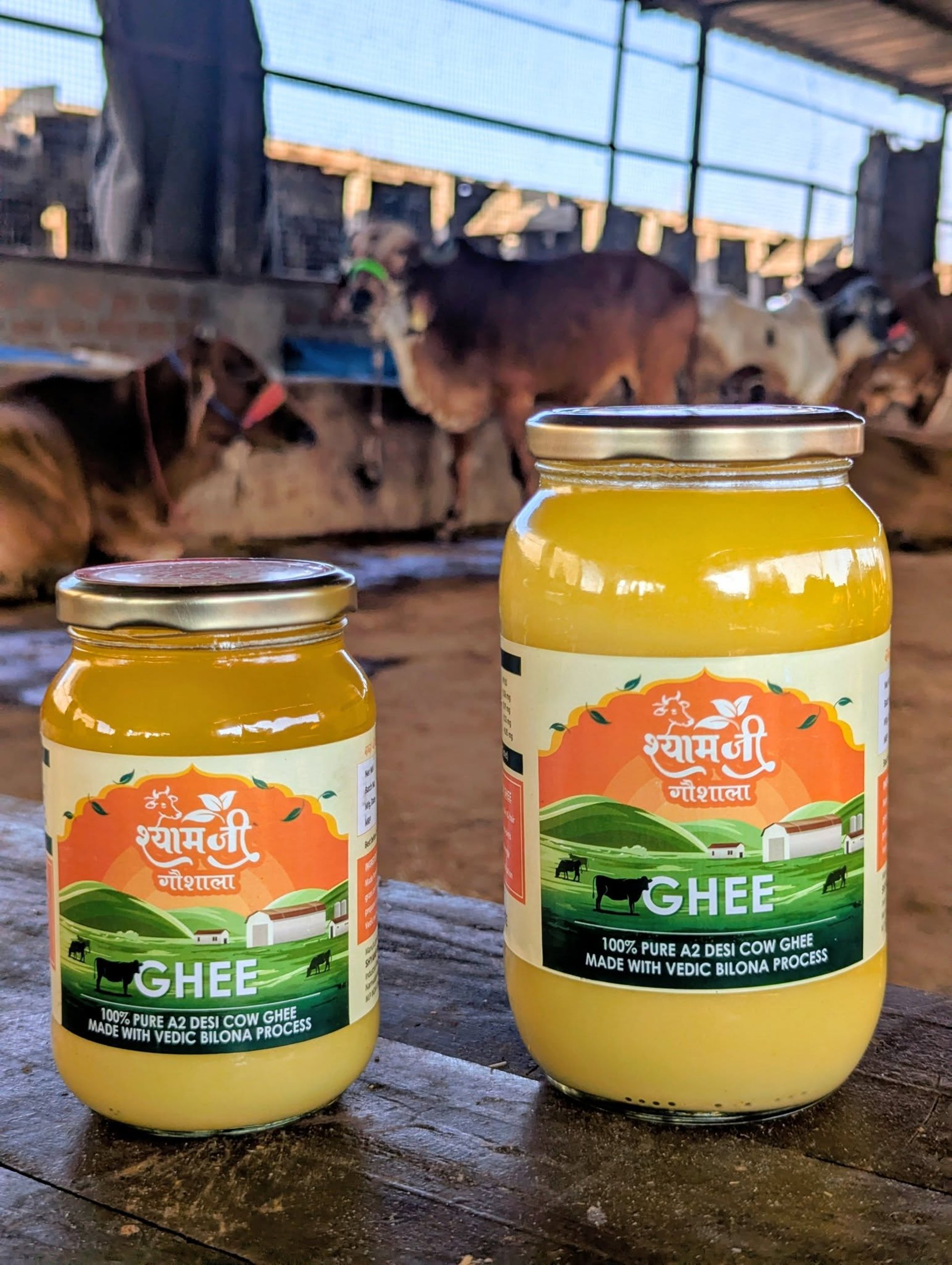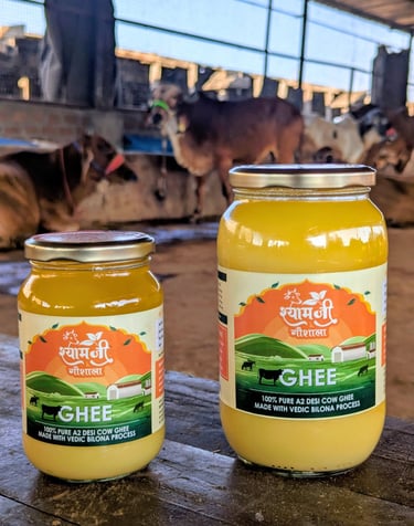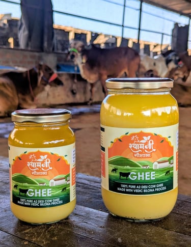 श्याम जी गौशाला में हम देसी गिर/साहीवाल गायों की प्राकृतिक देखभाल करते हैं और उन्हीं के A2 दूध से पारंपरिक बिलौना विधि द्वारा शुद्ध घी बनाते हैं।